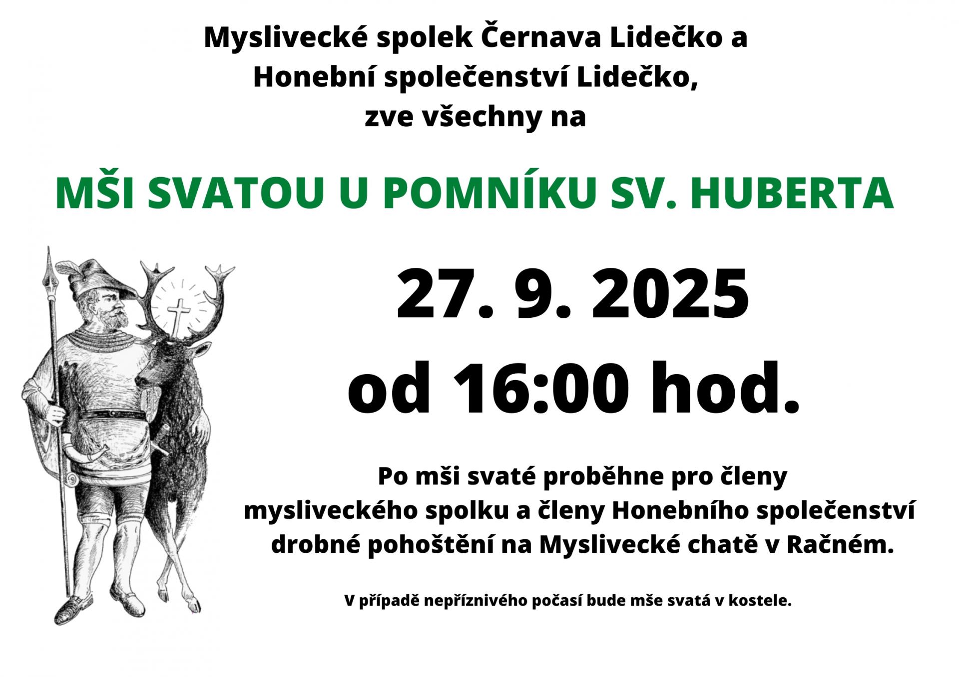 Myslivecký spolek Černava Lidečko a Honební společenství Lidečko zvou členy mysliveckého spolku a členy Honebního společenstva na tradiční mši svatou u pomníku sv. Huberta v Račném, která se uskuteční v sobotu 27. září 2025 v 16:00 hodin. Za nepříznivého počasí bude mše sloužena v kostele v Lidečku. Po mši svaté bude na myslivecké chatě v Račném drobné pohoštění. Srdečně zvou myslivci a Honební společenstvo.