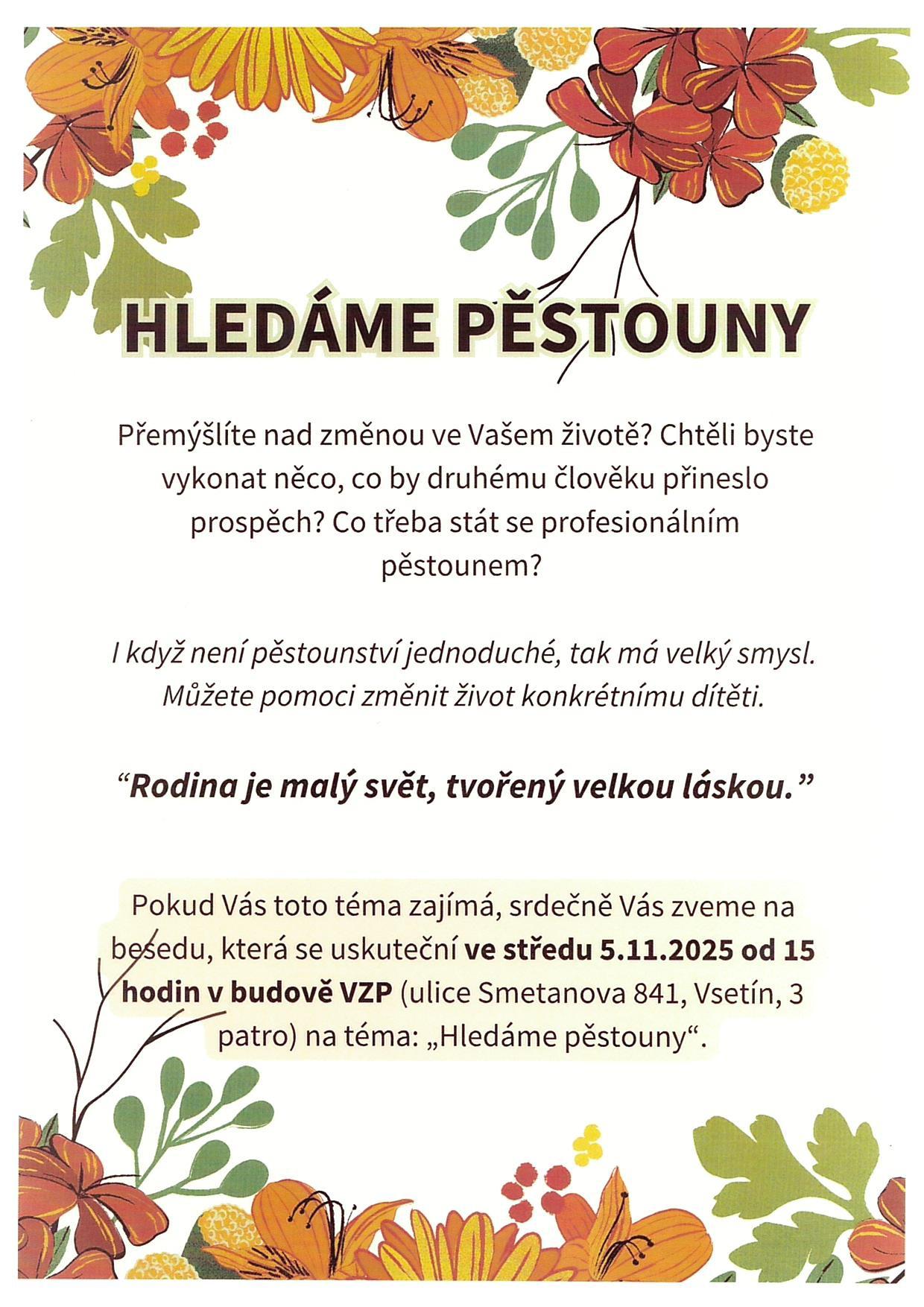 Besedu s názvem "Hledáme pěstouny" se uskuteční ve středu 5. listopadu 2025 od 15 hodin v budově VZP ve Vsetíně - v prostorách doprovázející organizace.