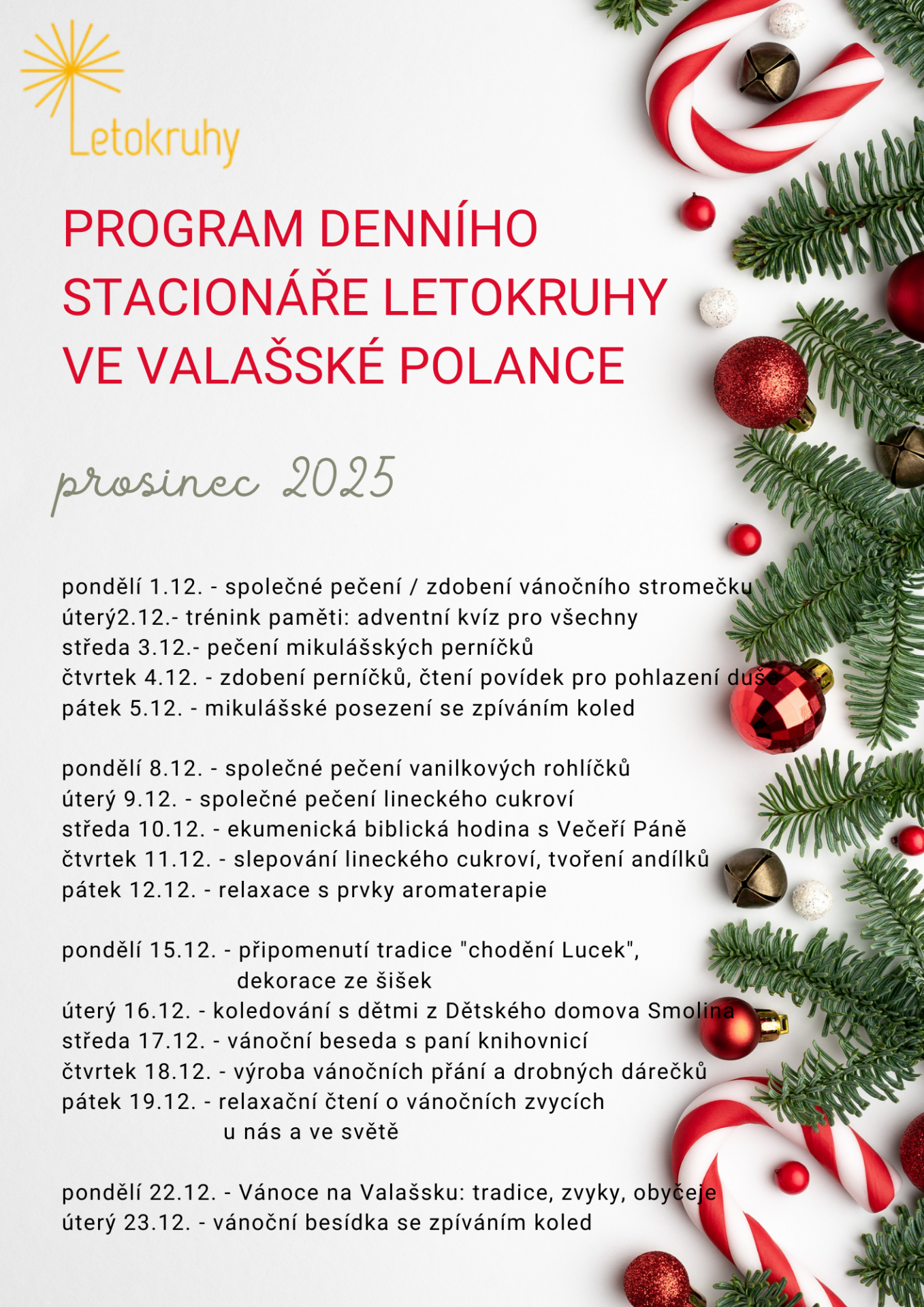 Program Denního stacionáře Letokruhy ve Valašské Polance prosinec 2025. Stacionář je sociální služba určená nejen seniorům, ale i lidem starším 18 let s postižením či zdravotním omezením.
