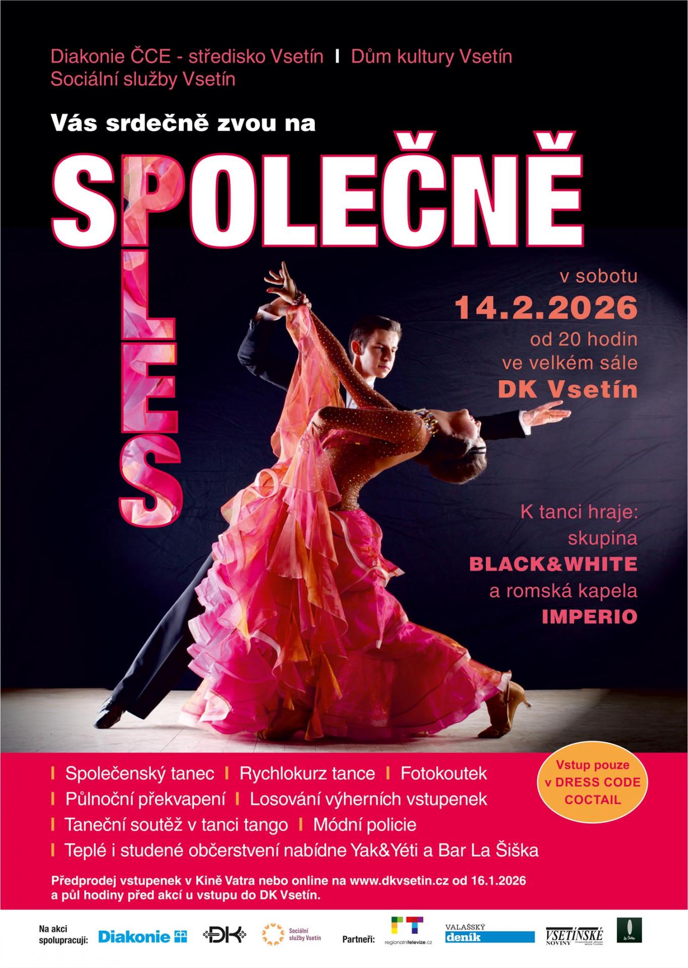 Další ročník multikulturního plesu Společně se uskuteční v sobotu 14. února v Domě kultury Vsetín od 20 hodin. Proč si tento večer nenechat ujít? Ples Společně není jen o tanci, je o setkávání. Je to místo, kde mizí bariéry a kde se na jednom parketu potkávají lidé všech generací a osudů v rytmu, který Vás nenechá sedět. Co Vás roztančí? • Black & White: oblíbená klasika pro milovníky poctivého tanečního umění. • Imperio: temperamentní romská kapela, která do sálu vlije vášeň a živý rytmus. Zážitky navíc: • Taneční workshop: pod vedením tanečních mistrů se společně naučíme tango a v následné taneční soutěži změříme síly. • Módní policie ocení nejstylovější outfity večera. • Půlnoční překvapení: zlatý hřeb programu, který Vás zaručeně zvedne ze židlí. • Fotokoutek a losování výherních vstupenek. Občerstvení zajistí restaurace YAK & YETI a bar La Šiška.