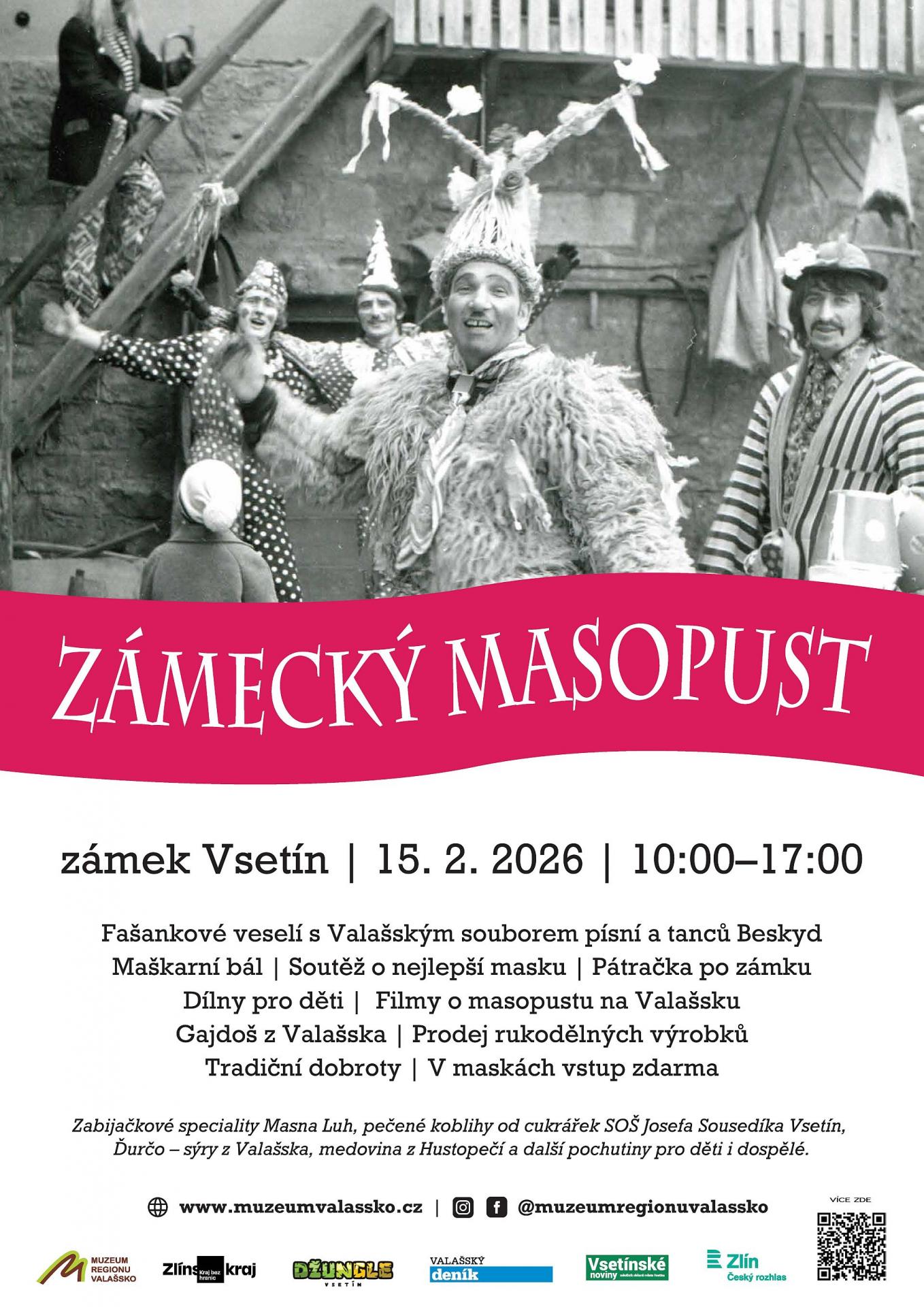 Den plný fašankových tradic, vystoupení, dobrot a zábavy pro všechny generace nabídne další ročník oblíbené akce Zámecký masopust, který proběhne v neděli 15. února v Muzeu regionu Valašsko na zámku Vsetín. Folklorní pásmo letos obstará známý Valašský soubor písní a tanců Beskyd ze Zubří. Chybět nebude oblíbená pátračka po zámku či dětský karneval se soutěží o nejlepší masku, ve které se hraje o 5 vstupenek do zábavného centra Džungle Vsetín a další ceny. Návštěvníci v karnevalových maskách navíc mají vstup zdarma. Cukrářky ze SOŠ Josefa Sousedíka Vsetín Vám přímo na místě upečou tradiční koblihy. Dorazí i další prodejci s různými regionálními pochutinami a rukodělnými výrobky. Na děti čekají tvůrčí dílny a další atrakce. Dospělé by zase určitě mohly zajímat dokumentární filmy o historii masopustu na Valašsko. Zkrátka a dobře, bude toho hodně pro všechny.