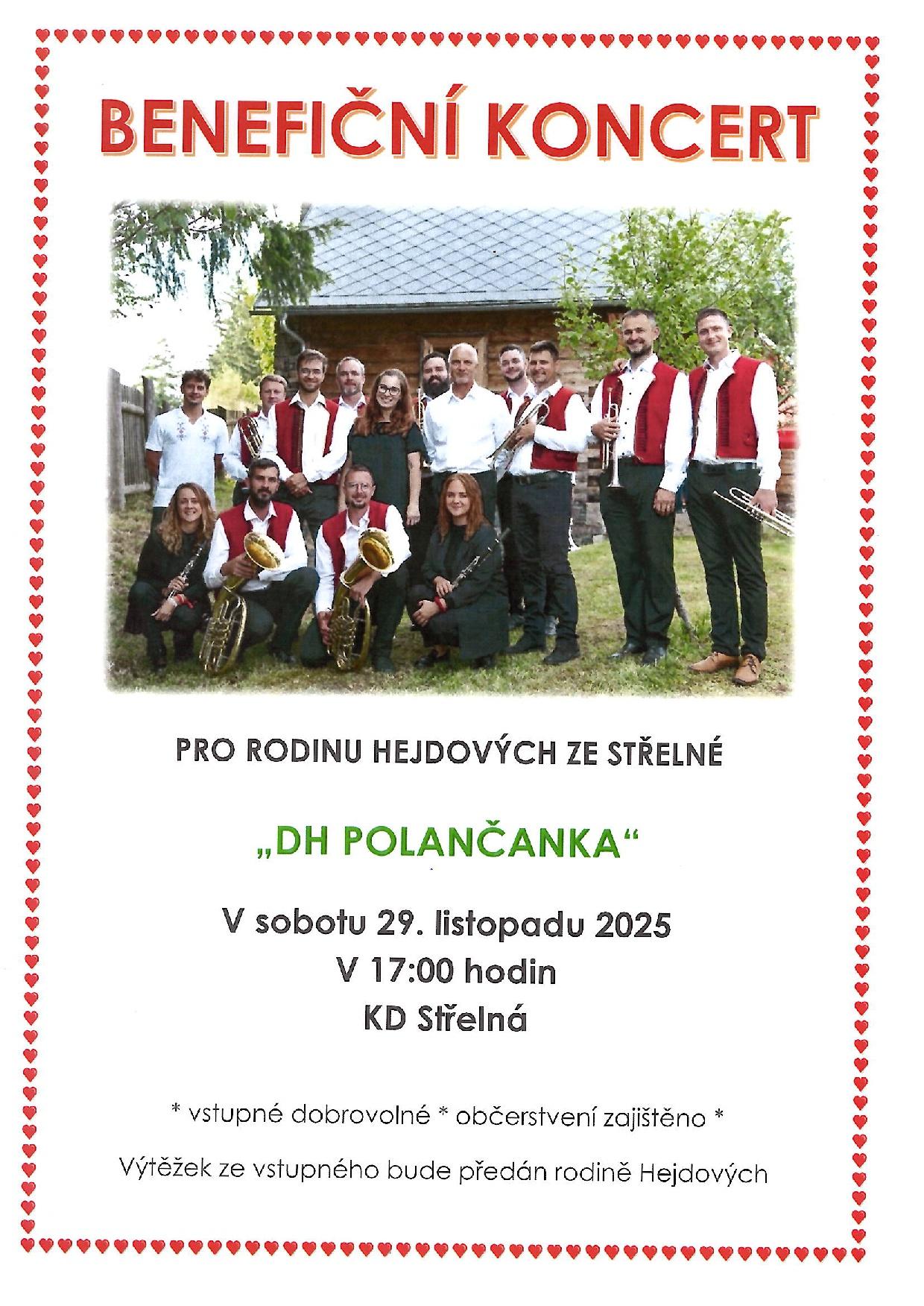 Benefiční koncert dechové hudby Polančanka, se uskuteční v sobotu 29. listopadu 2025 ve Střelné na podporu pozůstalé rodiny po tragicky zesnulém otci Lukáši Hejdovi