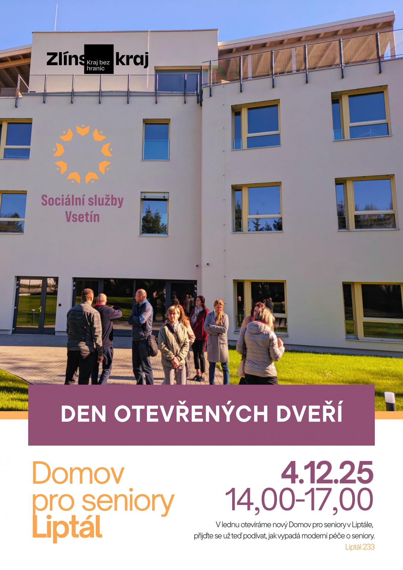 Den otevřených dveří Domov pro seniory Liptál se pro veřejnost uskuteční 4. prosince 2025 v čase od 14:00 do 17:00 hodin.