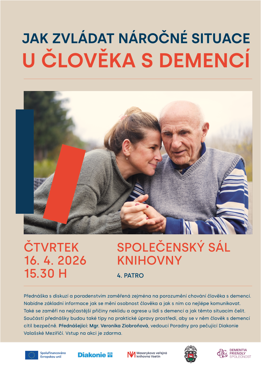 Péče o blízkého s demencí přináší rodinám, a mnohdy i okolí, řadu psychicky i fyzicky náročných momentů. Jak porozumět změnám v chování nemocného a jak efektivně čelit projevům neklidu či agrese? Odpovědi na tyto otázky nabídne přednáška „Jak zvládat náročné situace u člověka s demencí“, která se uskuteční ve čtvrtek 16. dubna 2026 od 15.30 hodin v přednáškovém sále Masarykovy veřejné knihovny Vsetín.